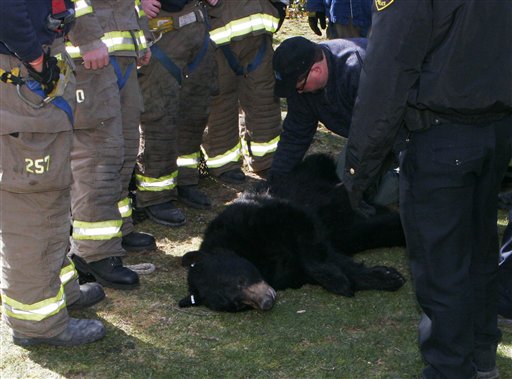 The bear remained wedged in a web of branches until it was shot with a tranquilizer dart Sunday. The bear hung on for 10 minutes before dropping neatly into a taut net set up below.